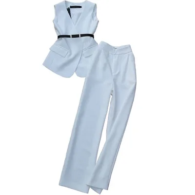 Женский брючный костюм из двух предметов, повседневный белый жилет с V-образным вырезом и брюки в Корейском стиле, весна-осень