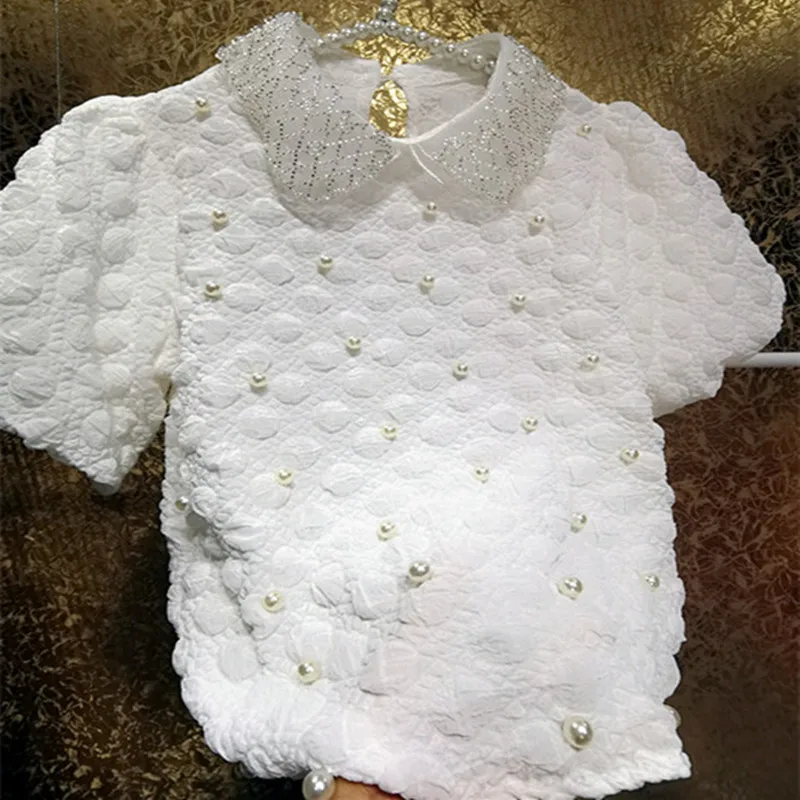 Тяжелая промышленность жемчужная Стразы трехмерная футболка женская летняя мода милые футболки с пышными рукавами женские топы q143