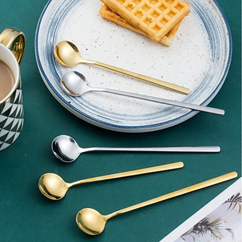 Удлиненная круглая ложка с длинной ручкой из нержавеющей стали в Корейском стиле, ложка для перемешивания кофе, молока, Золотая и серебряна...