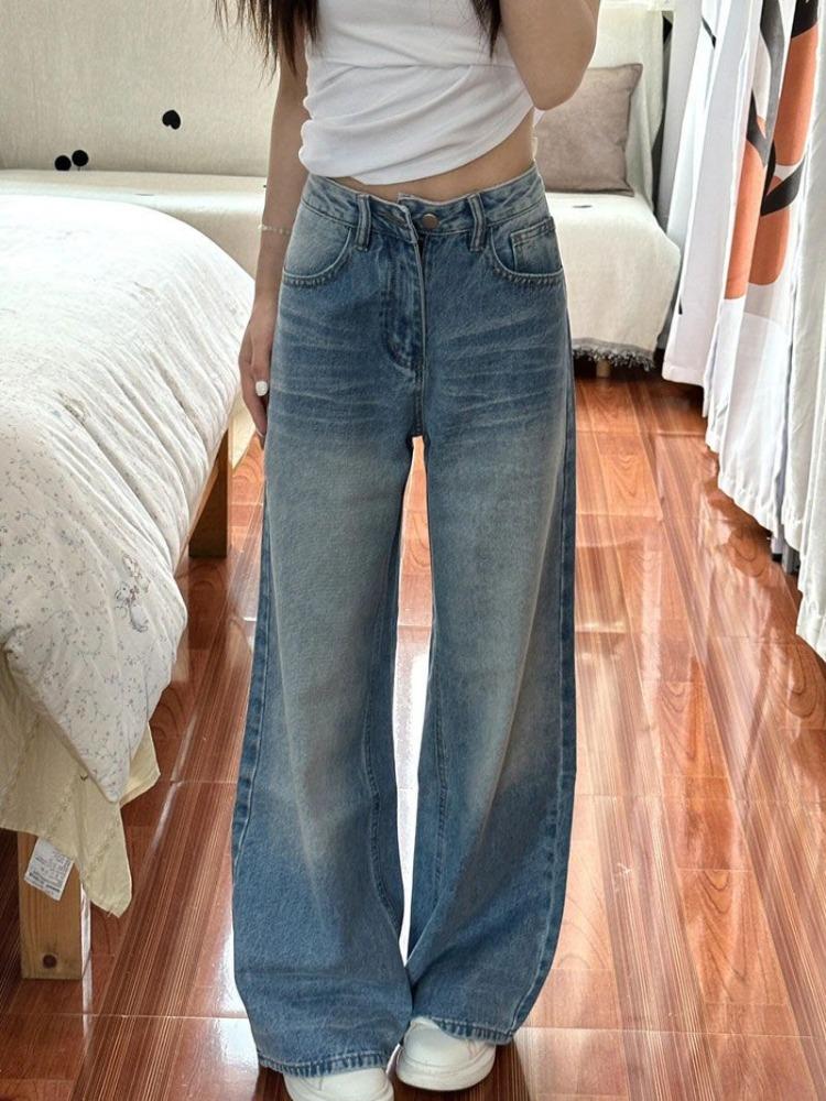 Удобная ностальгия Большой размер Вареные Мятые Широкие джинсы Женские С высокой талией Свободные Прямые Мелованные Белые Брюки в пол Длинные Джинсовые брюки 4XL