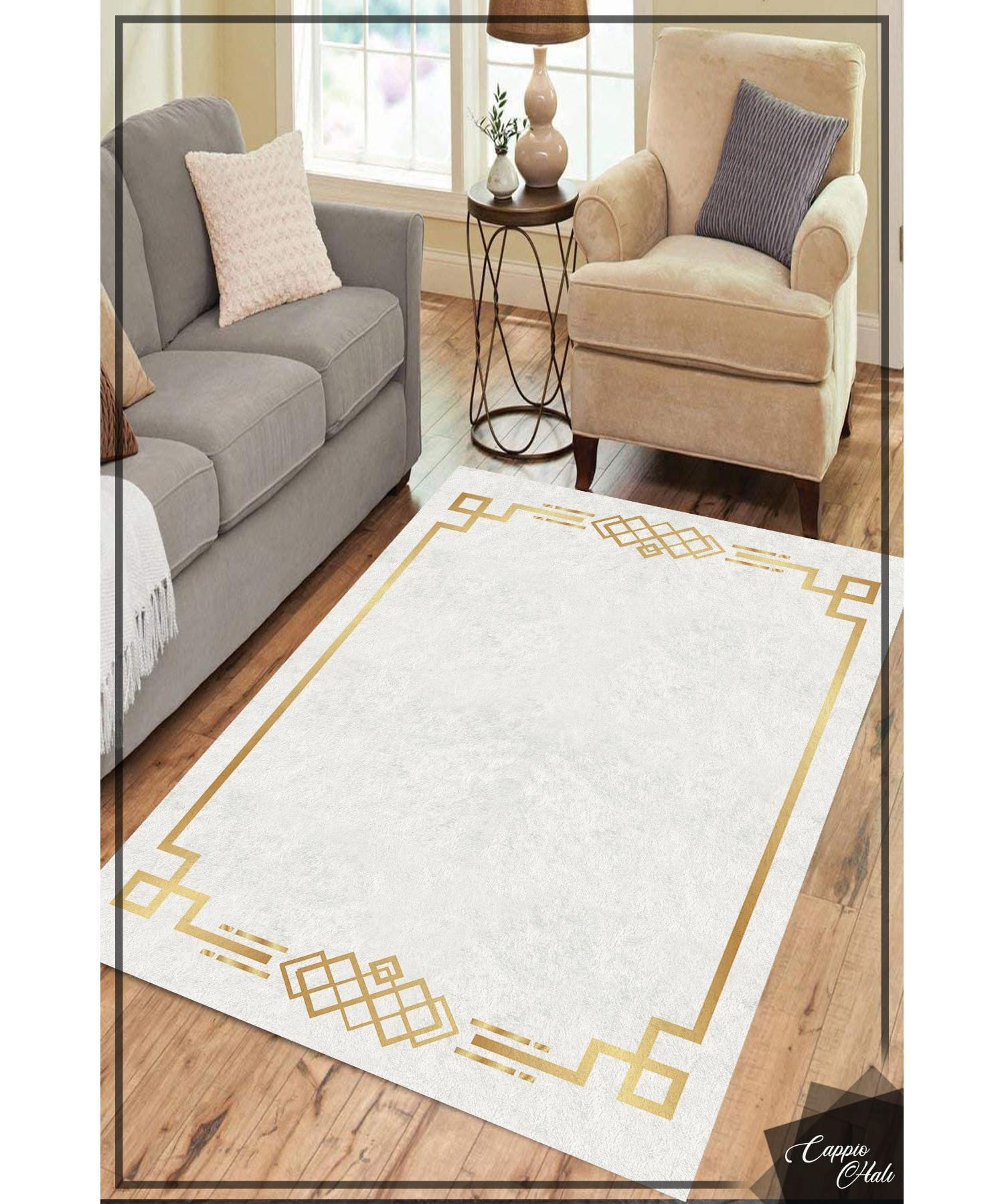 Узорчатый белый ковер с золотой рамкой (Нескользящее кожаное основание Машинная стирка 160x250) - Cp1058