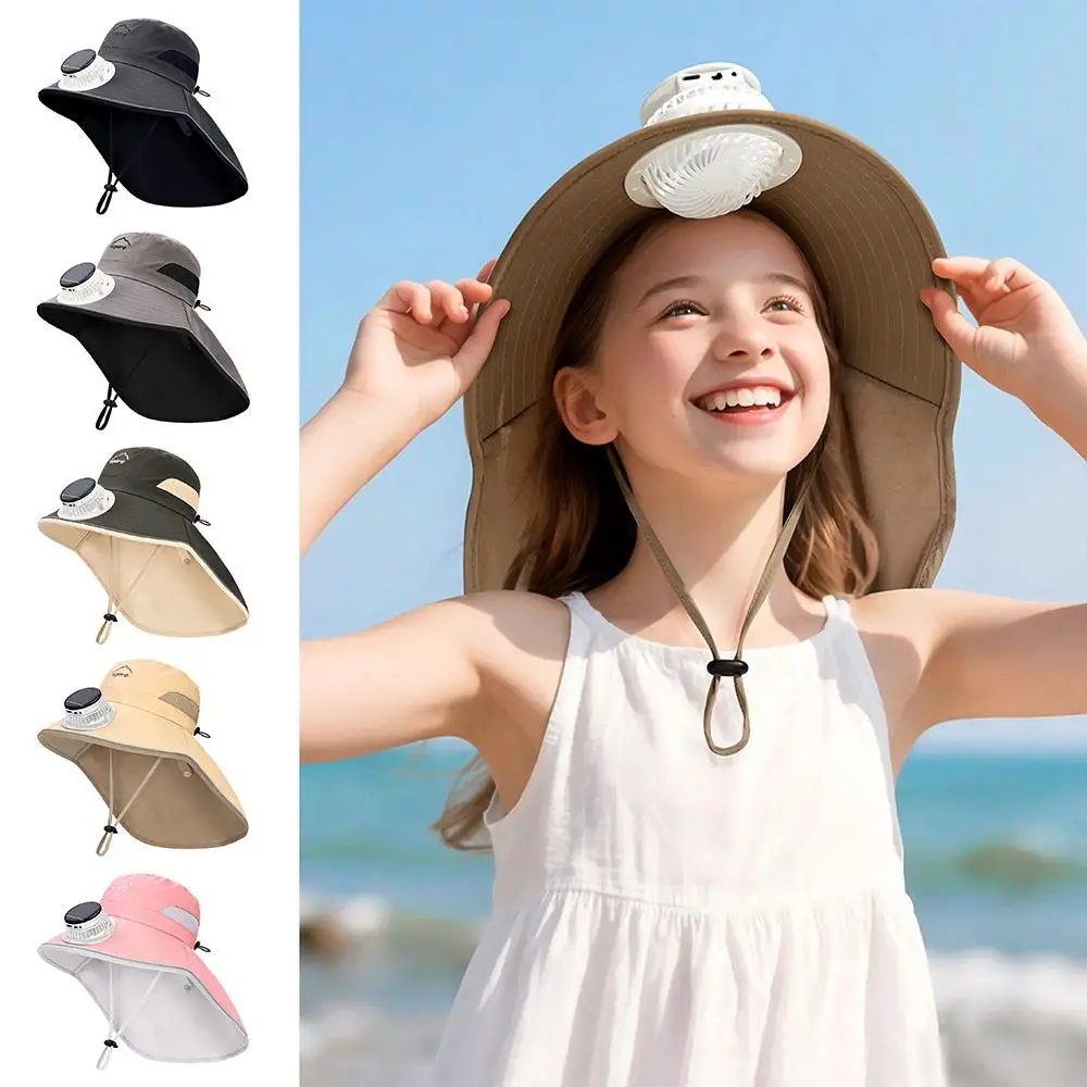 Уличная детская шляпа от солнца с широкими полями и шейным клапаном, охлаждающая рыбацкая шляпа, дышащая шляпа с вентилятором на солнечной энергии для мальчиков и девочек