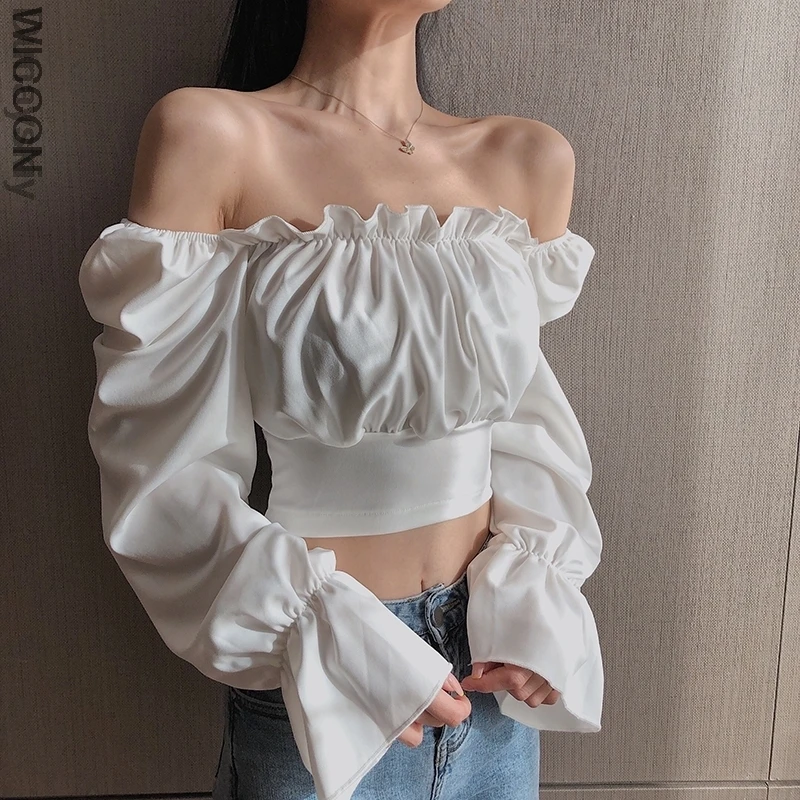 Женский топ Сексуальная Блузка с открытыми плечами однотонный топ с длинными рукавами, Цвет белая рубашка с буфами на рукавах рюшами туника...