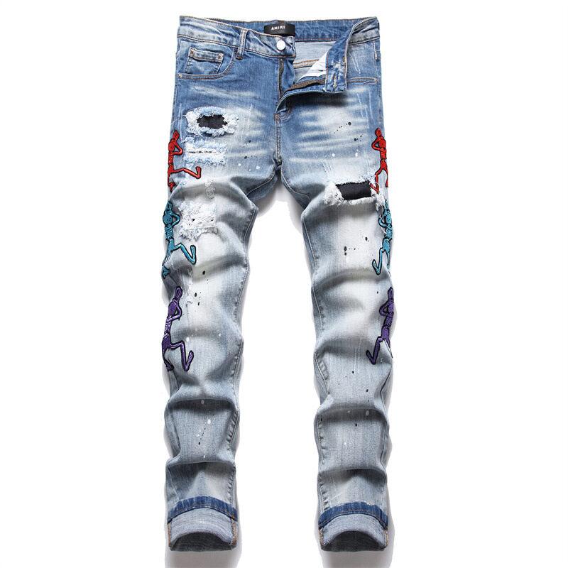 +Уличная мода, мужские джинсы с вышивкой, хлопковые брюки, молодежная мода, средняя талия для отдыха, 7002