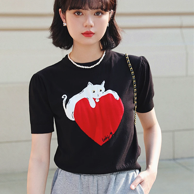 Уличная одежда, винтажные вязаные женские футболки с сердечками и кошками, милая Одежда для девочек, офисные женские топы, летние большие ра...