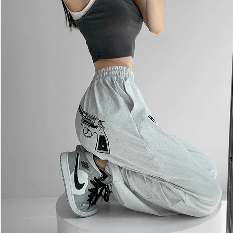 Уличная одежда, серые тренировочные штаны, женские спортивные брюки большого размера с принтом, черные спортивные брюки для бега, мешковаты...