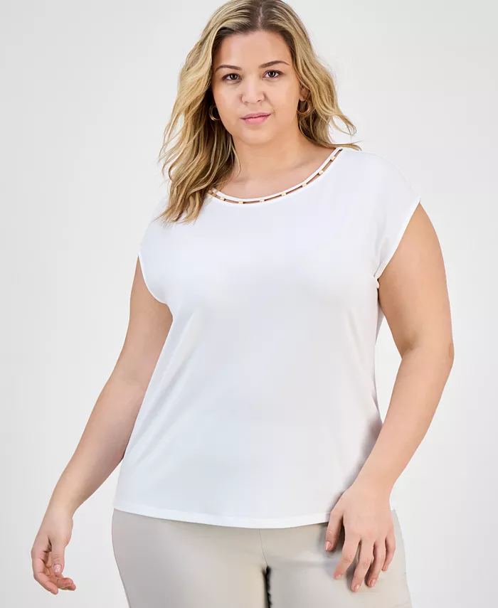 Трикотажный топ больших размеров с вырезом бисером и рукавами-крылышками Kasper, белый