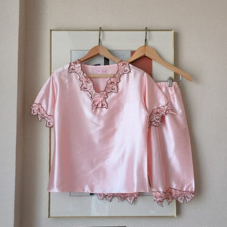 PIKADINGNIS WAVMIT Short Sleeve Pajamas Ice Silk Set 2Pcs Women Sleepwear Shirt V-neck Polyester Nightwear for Women ShortTop Pant Homewear