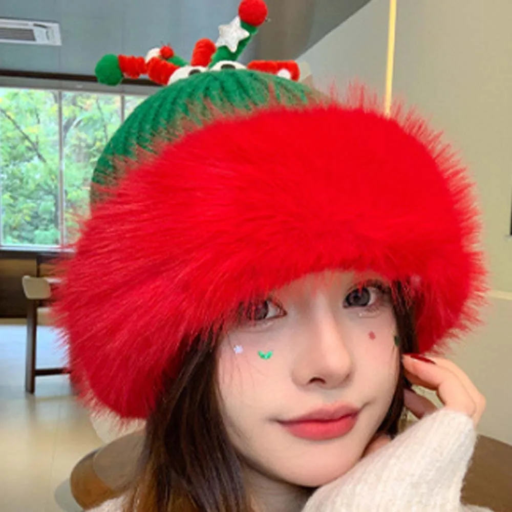Универсальная мягкая рождественская плюшевая шапка, ветрозащитная плюшевая красная вязаная шерстяная шапка, тканая шапка с большими глазами, большой пуловер, осенняя шапка