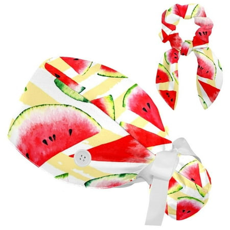 Working Cap with Buttons and Sweatband Scrub Hat Bouffant Caps with Scrunchie Watermelon Tie Back Hats