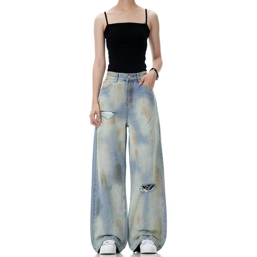Унисекс Ретро Джинсы из Вареного Денима с Принтом Тай-Дай - Свободные Брюки Клеш Микро с Широкими Штанинами L синий