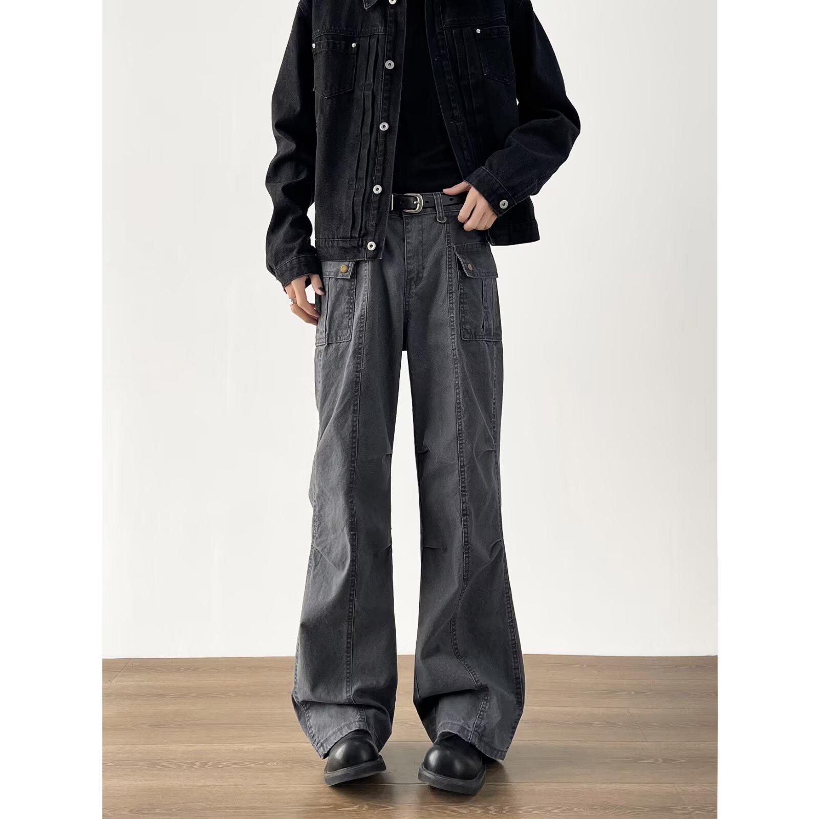 Унисекс Ретро Темно-серые Джинсы Рабочая одежда с несколькими карманами и складками - Прямой крой, Свободная повседневная посадка XL