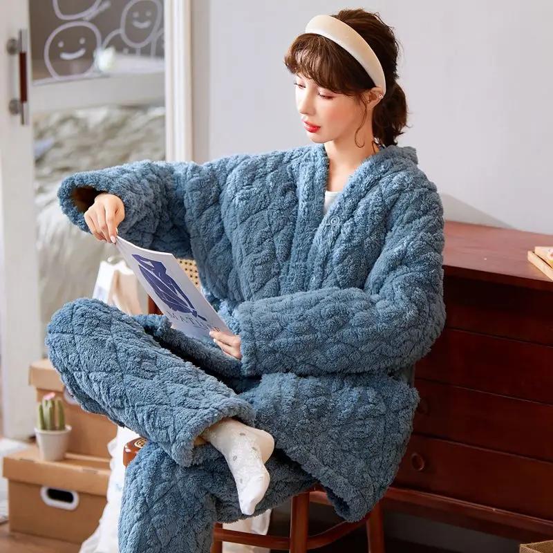 Утепленная трехслойная пижама из хлопка для женщин, зимняя коралловая бархатная пижама с длинными рукавами, теплая фланелевая домашняя одежда 2XL