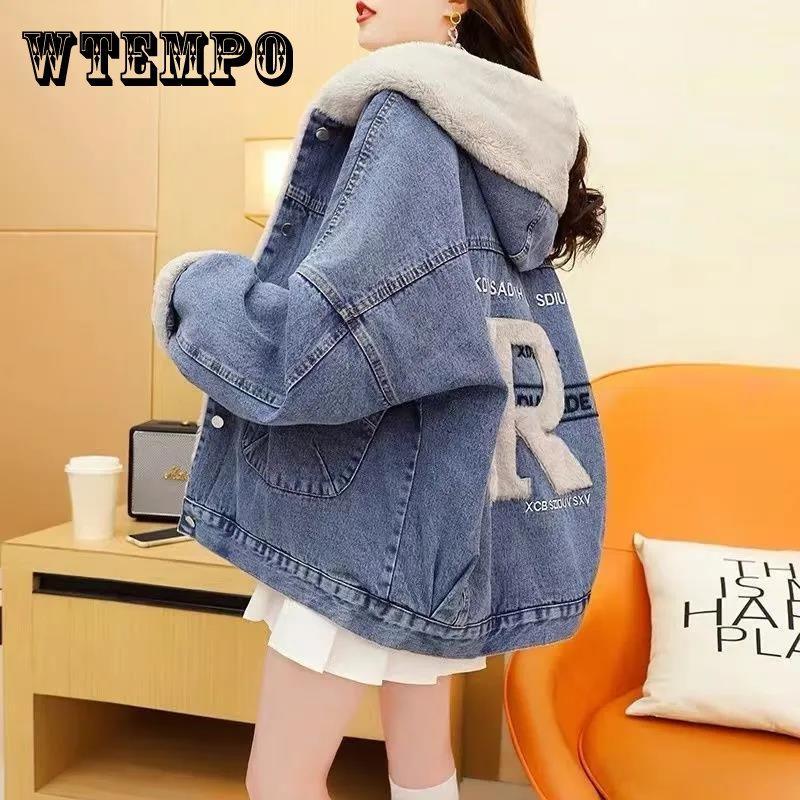 Утепленная флисовая джинсовая куртка с капюшоном, женская короткая осенне-зимняя свободная универсальная хлопковая модная верхняя одежда