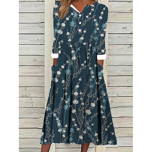 Women's A Line Dress Midi Dress Navy Blue Half Sleeve Floral Print Print Fall Winter V Neck Stylish Modern 2022 S M L XL 2XL 3XL