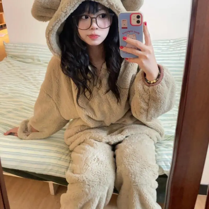 Утолщенная фланелевая пижама из кораллового флиса, пижамы для девочек, домашняя одежда с капюшоном, ночная рубашка, женская милая верхняя одежда на молнии, осень-зима