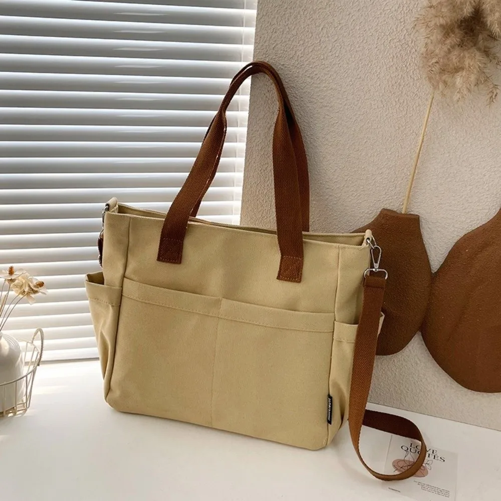 Утолщенная холщовая сумка на молнии с несколькими карманами, дорожная сумка через плечо, однотонная большая вместительная сумка в японском стиле для покупок