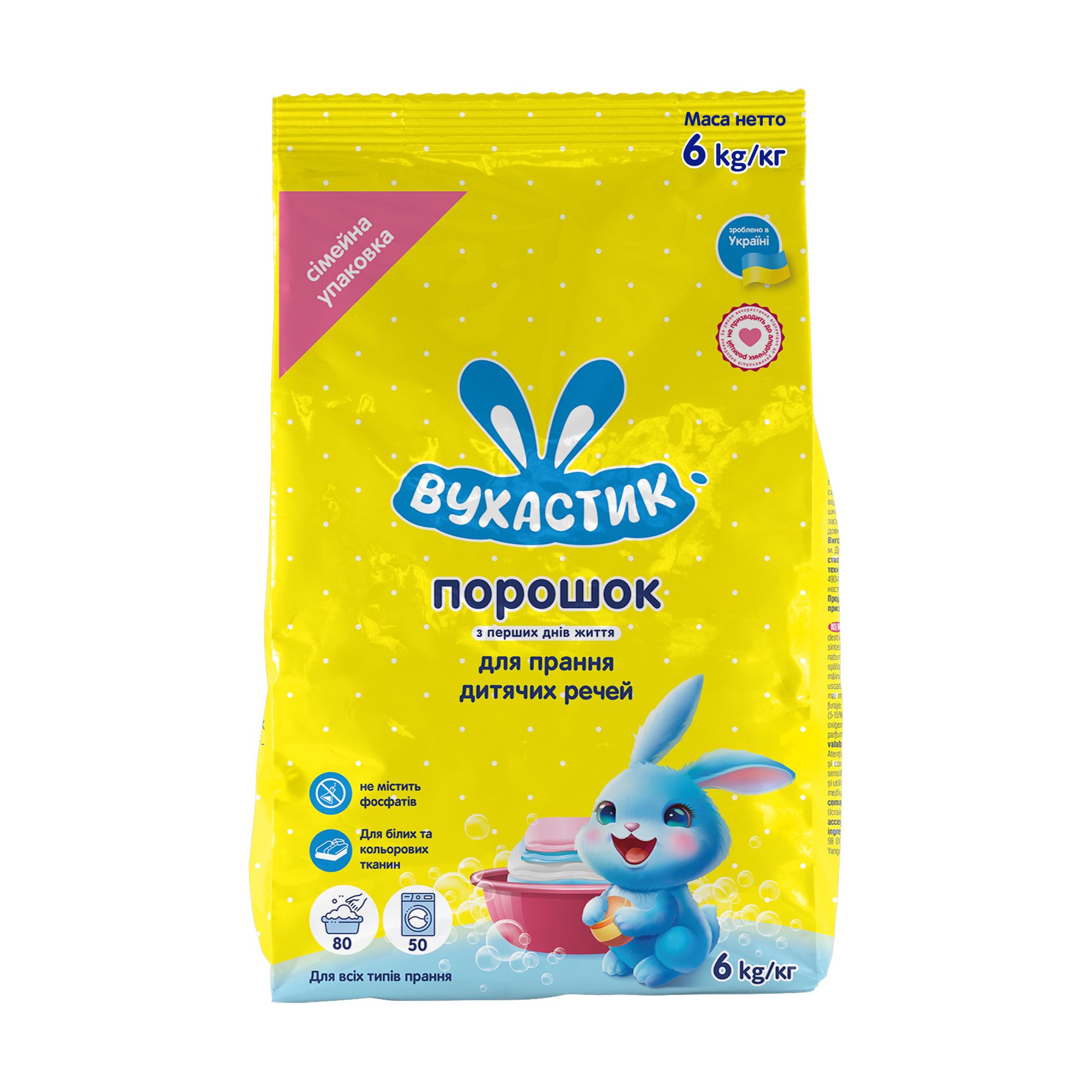 Уцінка! Пральний порошок Вухастик для прання дитячої білизни, 0+, 50 циклів прання, 6 кг