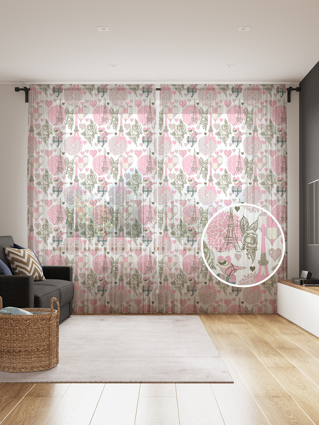 Фототюль JoyArty "В париж с цветами", 145x265см (2 полотна со шторной лентой + 50 крючков), В париж с цветами