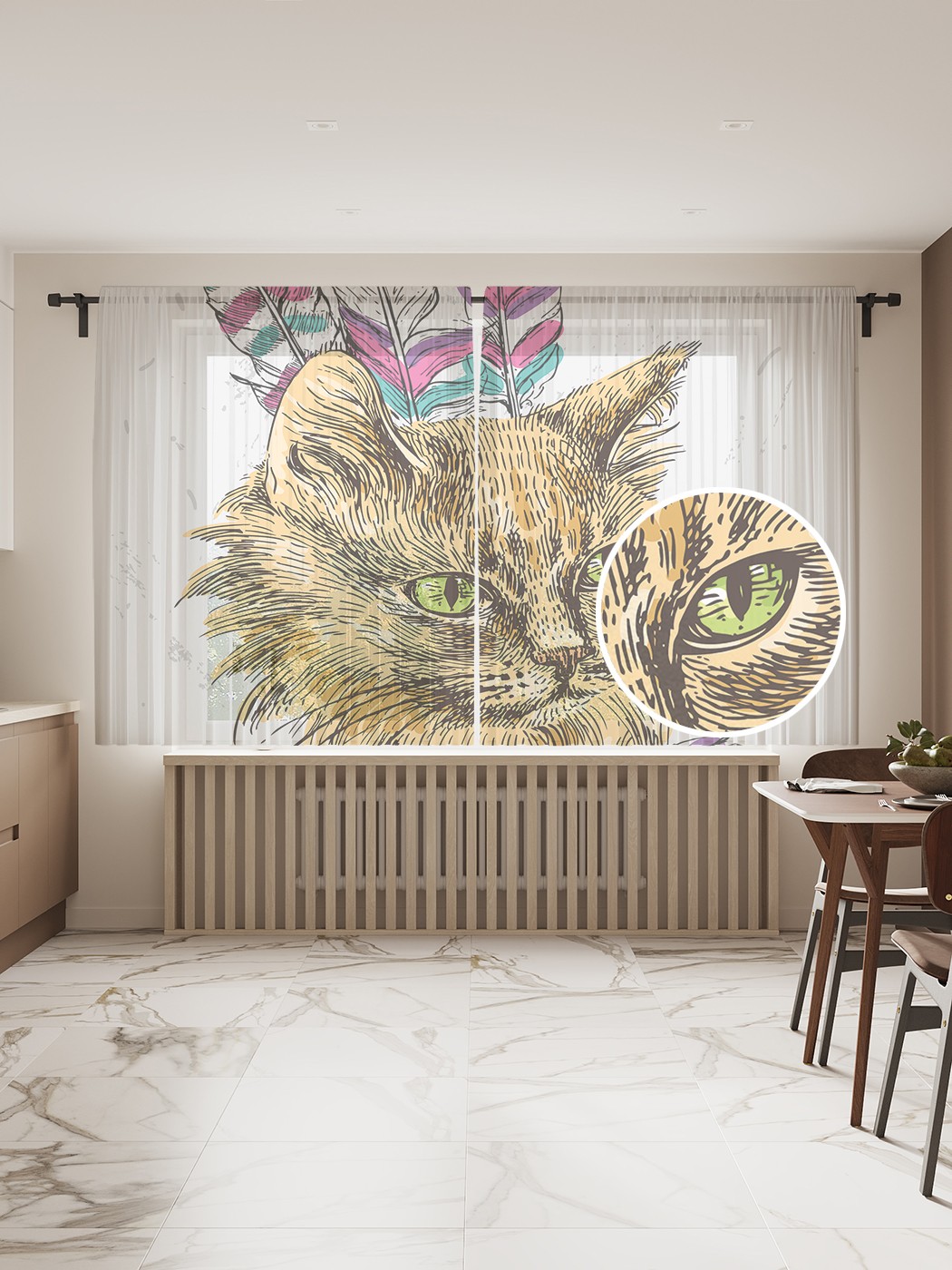 Фототюль JoyArty "Кот с перьями", 145x180 см (2 полотна со шторной лентой + 50 крючков), Кот с перьями