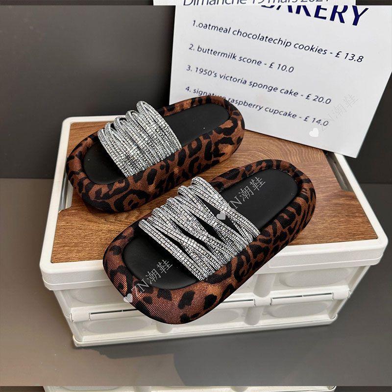 Французская высокая роскошь 18 стразов одно слово женские 2025 лето пляж увеличение роста новая верхняя одежда женские шлепанцы на толстой подошве 40 цветной печати леопарда