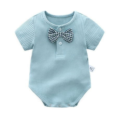 Toddler Baby Girls Climbing Clothes Unisex Solid Spring Summer Ribbed Short Sleeve Bow Tie Romper Bodysuit Clothes For 9-12 Months