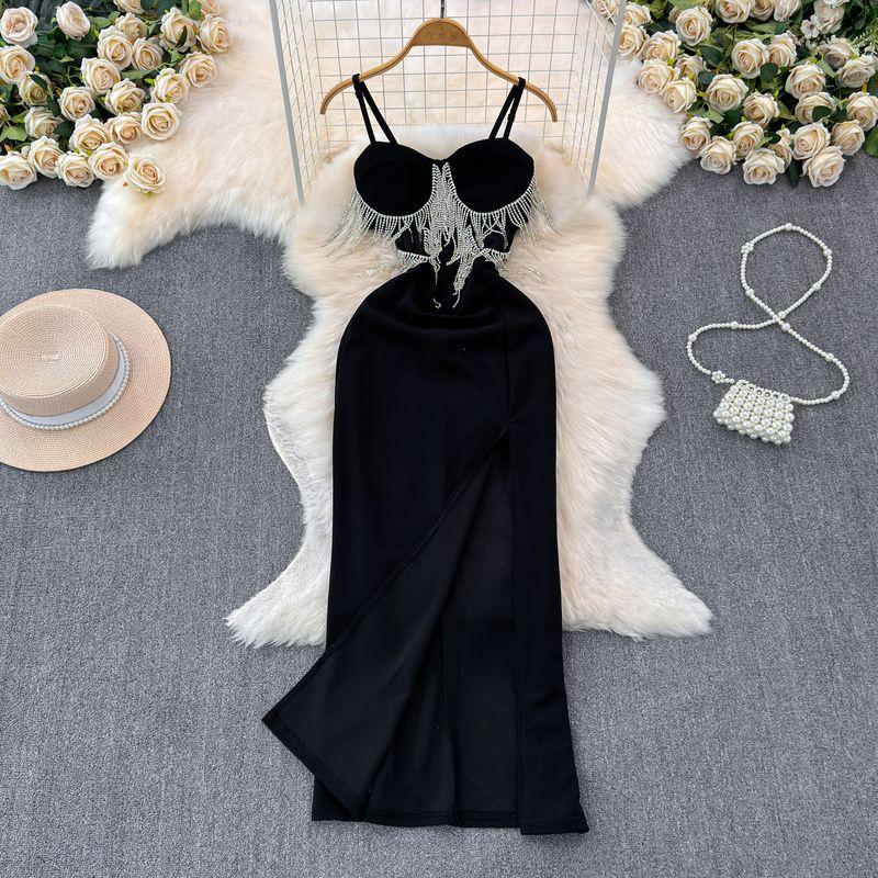 Французская светская львица полое платье на бретелях со стразами женское летнее элегантное стильное сексуальное с высоким разрезом банкетное вечернее платье Black M