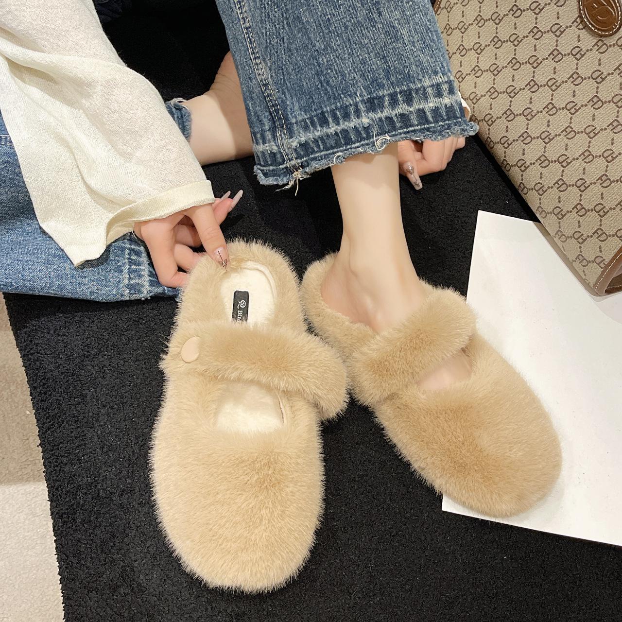 Французские плюшевые тапочки на плоской подошве для женской уличной обуви 2025 новая осень и зима универсальные плюшевые хлопковые тапочки на одной педали 40 хаки