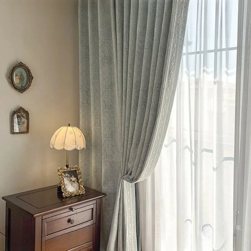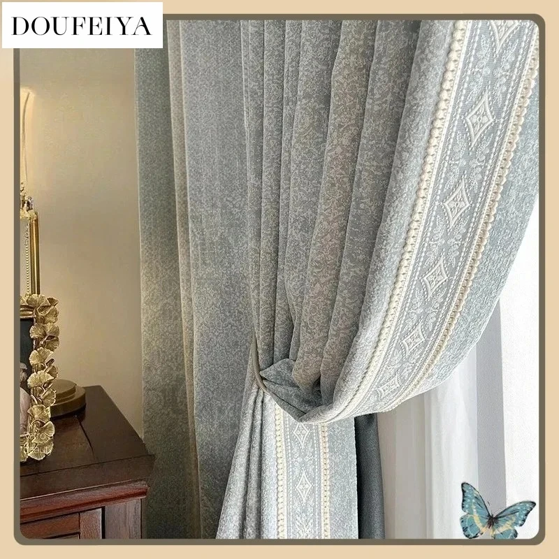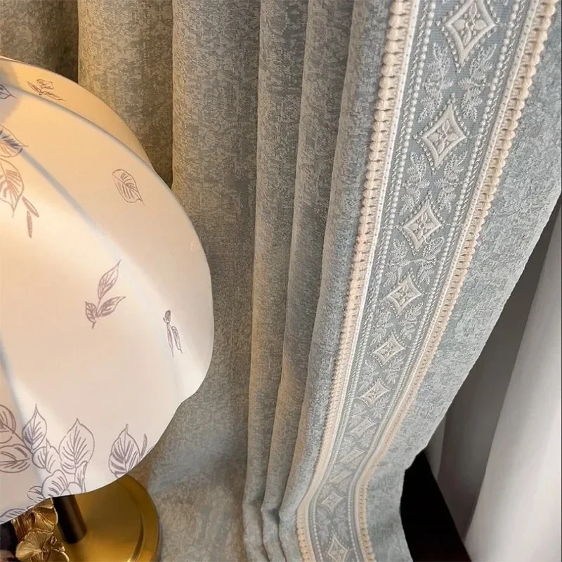 Французский Ретро Темный Узор Текстура Синель Серо-Синие Кружевные Шторы для Гостиной Столовой Спальни Нестандартного Размера Декор Окна