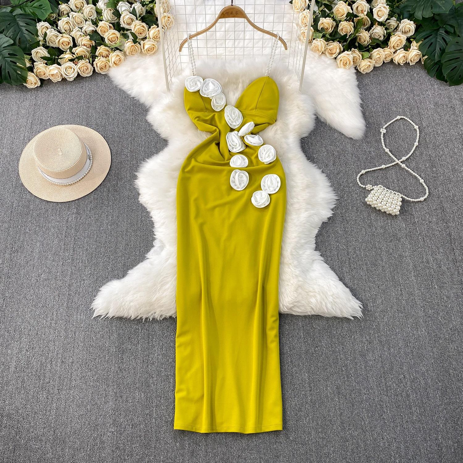 Французский темперамент Трехмерный цветок V-образный вырез Накладка на грудь Платье Женское Летнее Новое Приталенное и облегающее бедра платье с разрезом XL жёлтый