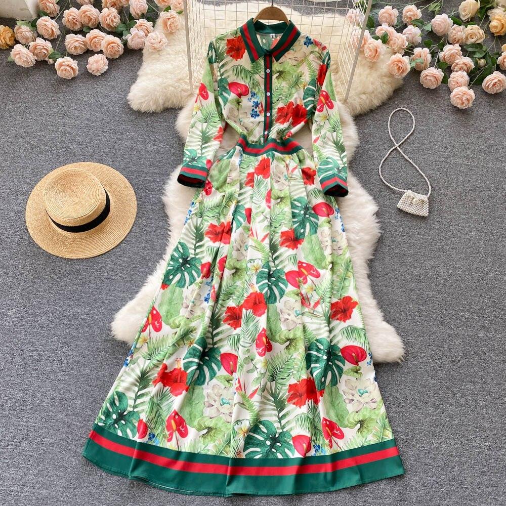 Французское банкетное платье, весна 2022, новый стиль, с лацканами и длинными рукавами, плиссированное большое свободное платье в иностранном стиле с принтом до щиколотки