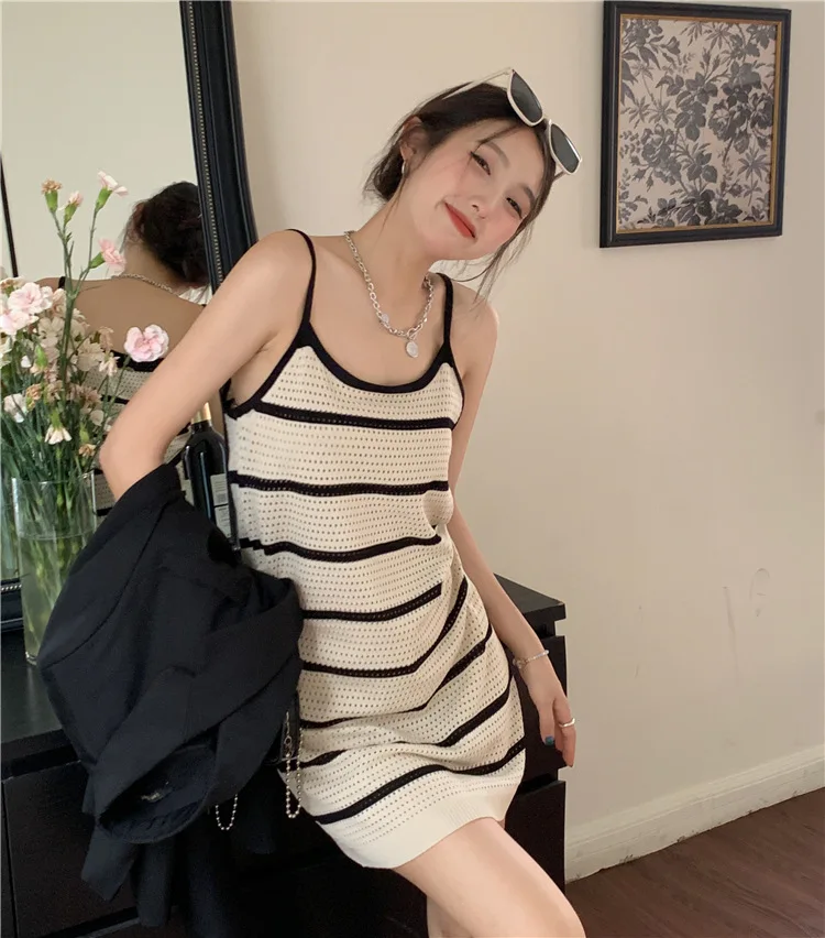 Французское дизайнерское нишевое платье в полоску, женское летнее платье с лямкой на шее, милая вязаная короткая юбка-жилет специй и ветра