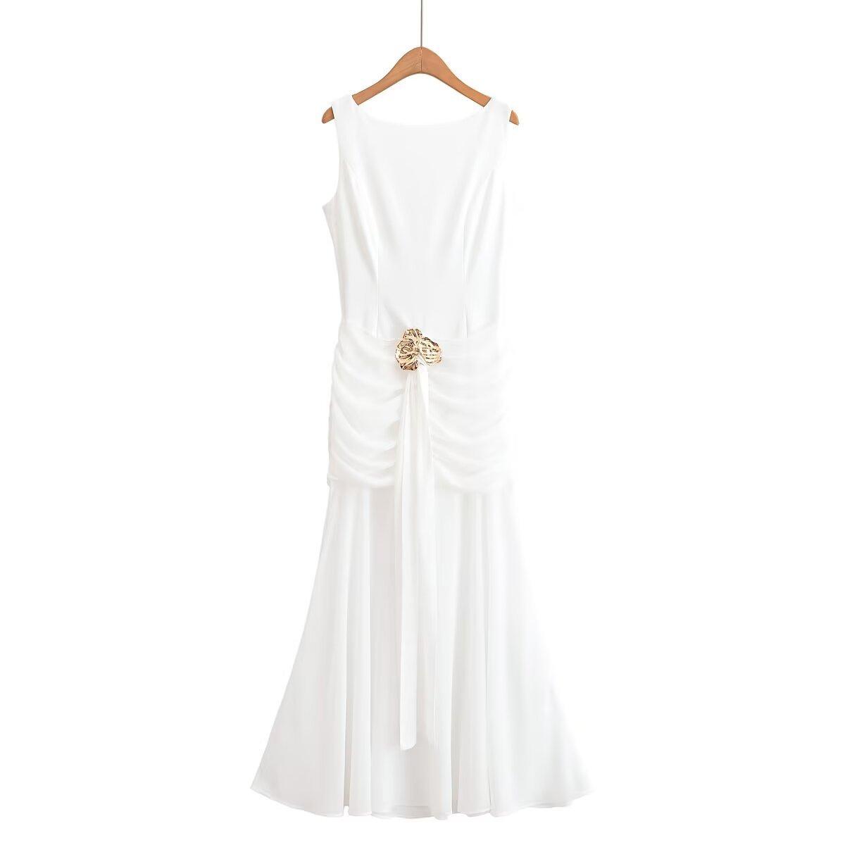 Французское металлическое платье-макси без спины с драпировкой, сексуальное, женское, винтажная мода, без рукавов, облегающее, элегантное, клубное, для вечеринок L белый
