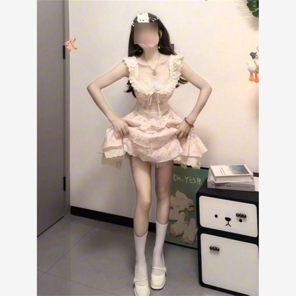 Французское милое цветочное платье лето новое маленькие рукава-крылышки пышная юбка тонкая талия фея короткая юбка японские женщины S- (can be worn within 45kg) розовый
