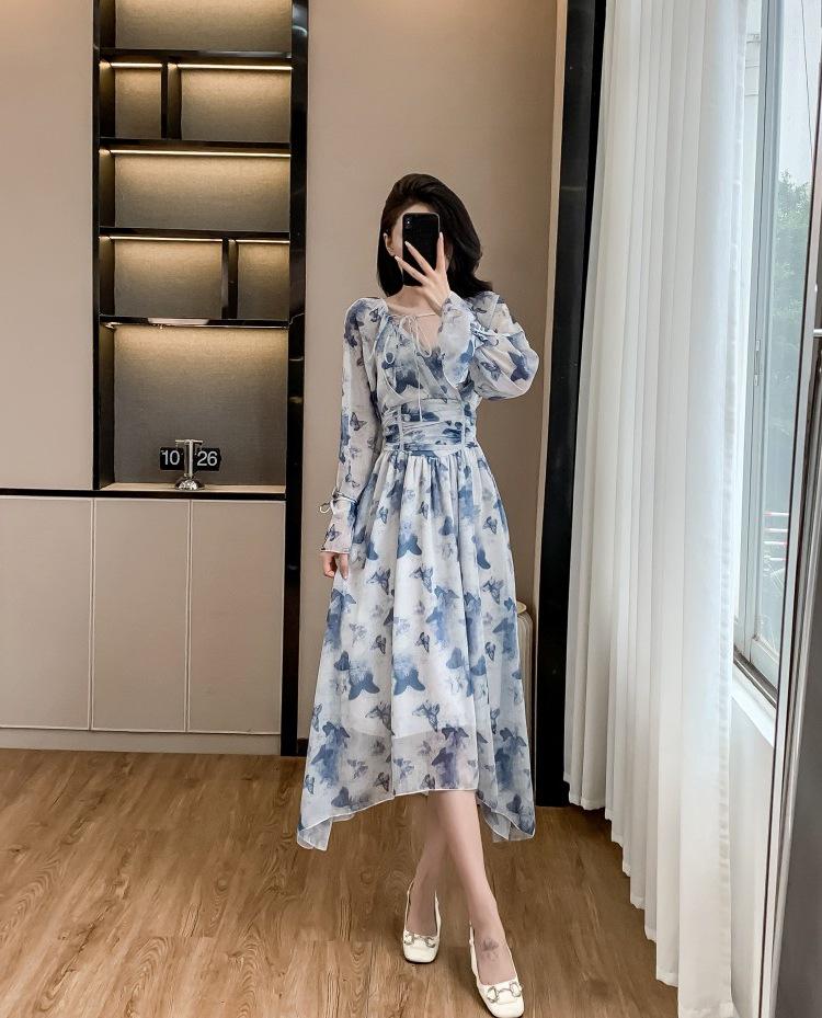 Французское платье синего цвета для чаепития: Приталенный корейский стиль с рукавами-рюшами, идеально подходит для отпуска Extra Large
