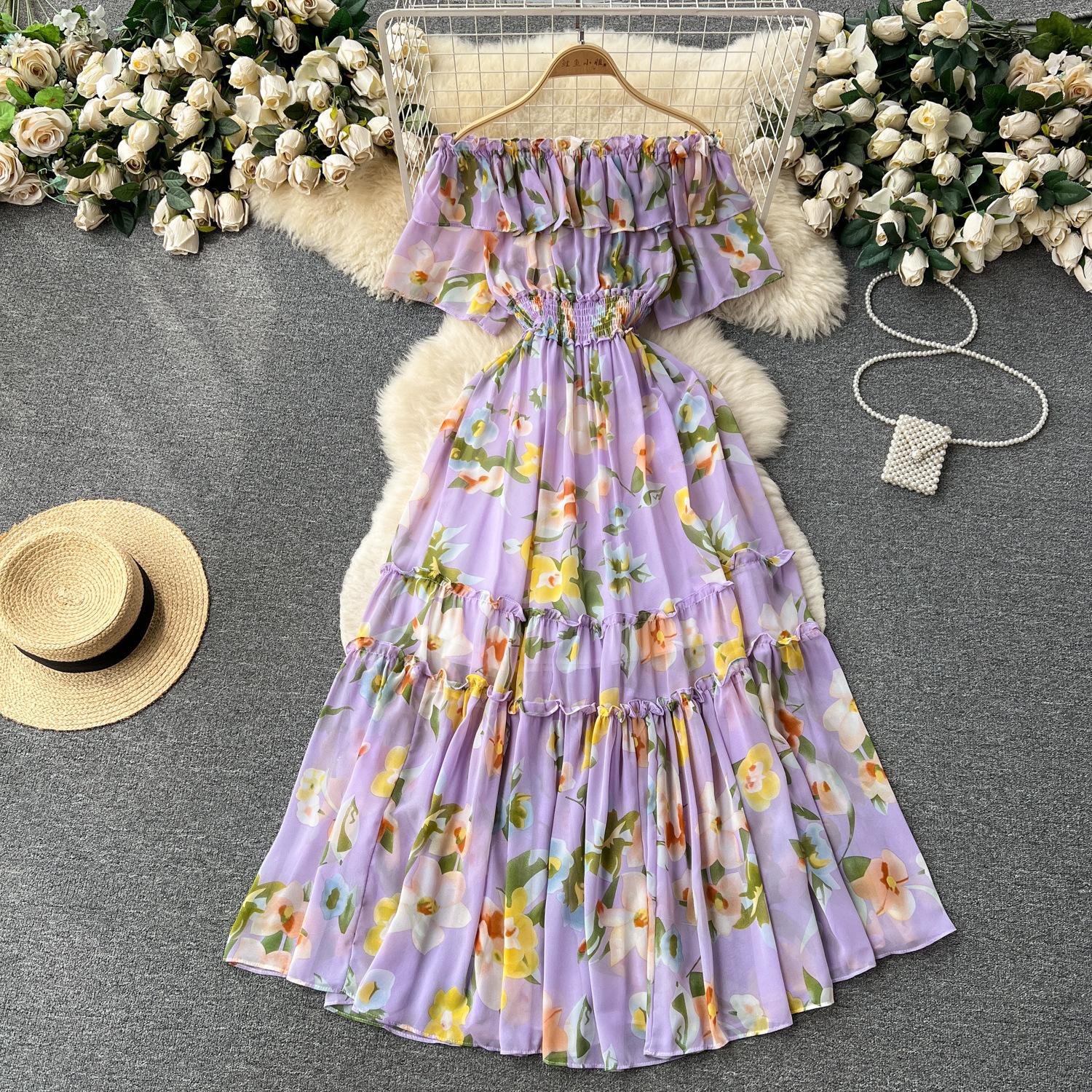 Французское повседневное женское шифоновое платье на одно плечо с рюшами и цветочным принтом на талии, женские тонкие темпераментные праздничные платья феи ветра для женщин One Size фиолетовый