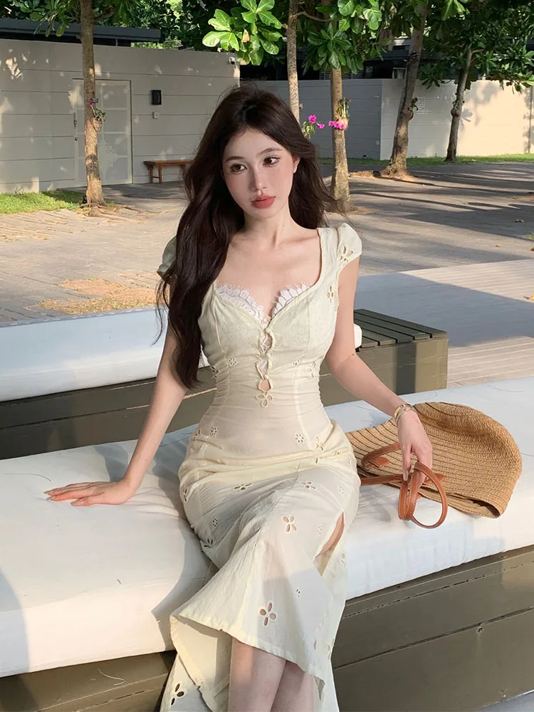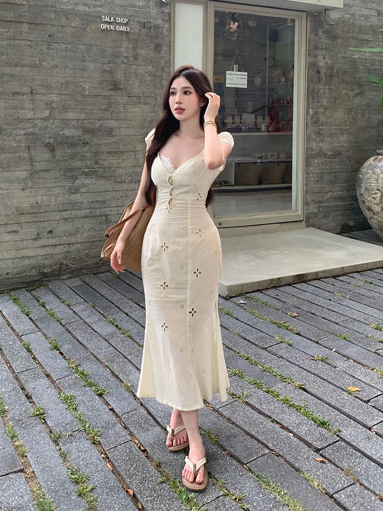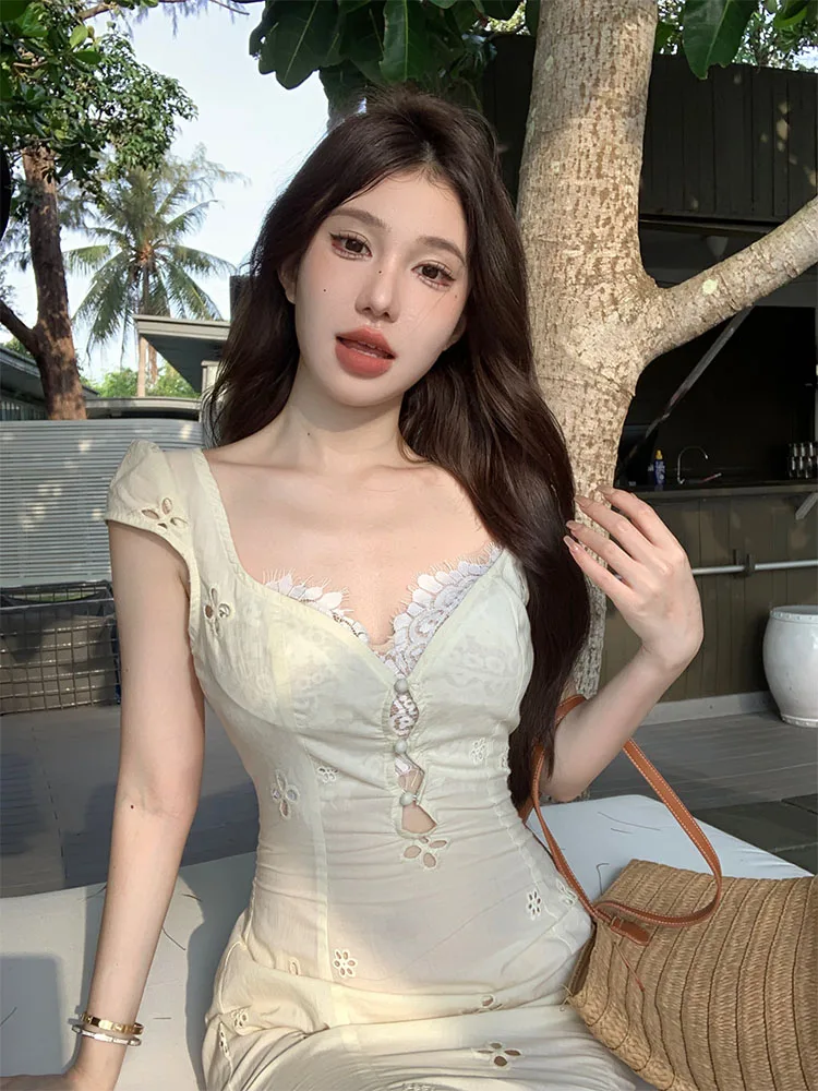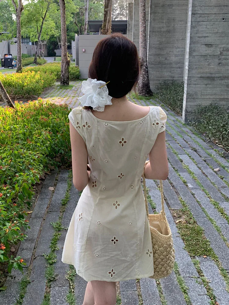 Французское элегантное бежевое сказочное платье, модное платье с квадратным вырезом для выпускного вечера, шикарное платье-трапеция в стиле K-POP, милая уличная одежда в стиле мори с вырезами