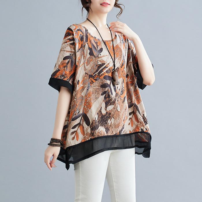 Футболка большого размера из хлопка и льна для женщин, летняя, новый стиль, литературный принт, свободная, с принтом мяса, повседневная, универсальная, с круглым вырезом и короткими рукавами 4XL