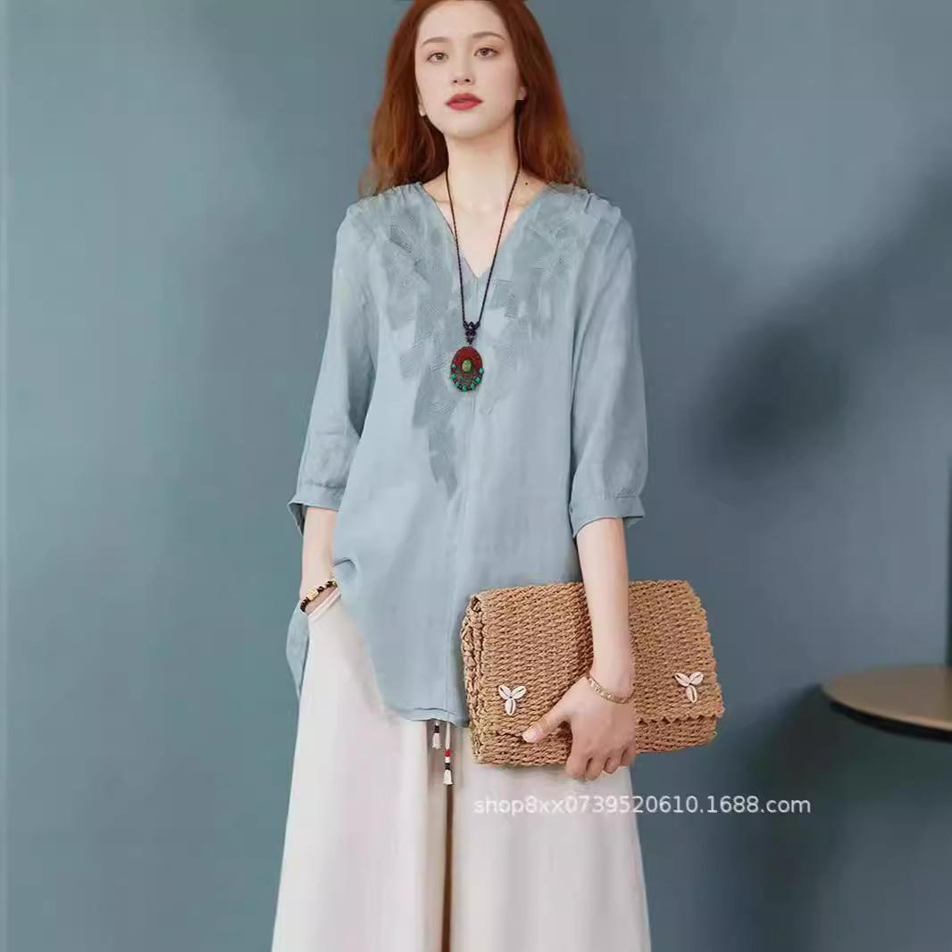 Футболка с коротким рукавом из хлопка и льна, женская летняя, новая, литературная, ретро, спереди, с укороченной спинкой, длинная, вышитая, с V-образным вырезом, однотонный льняной топ L белый