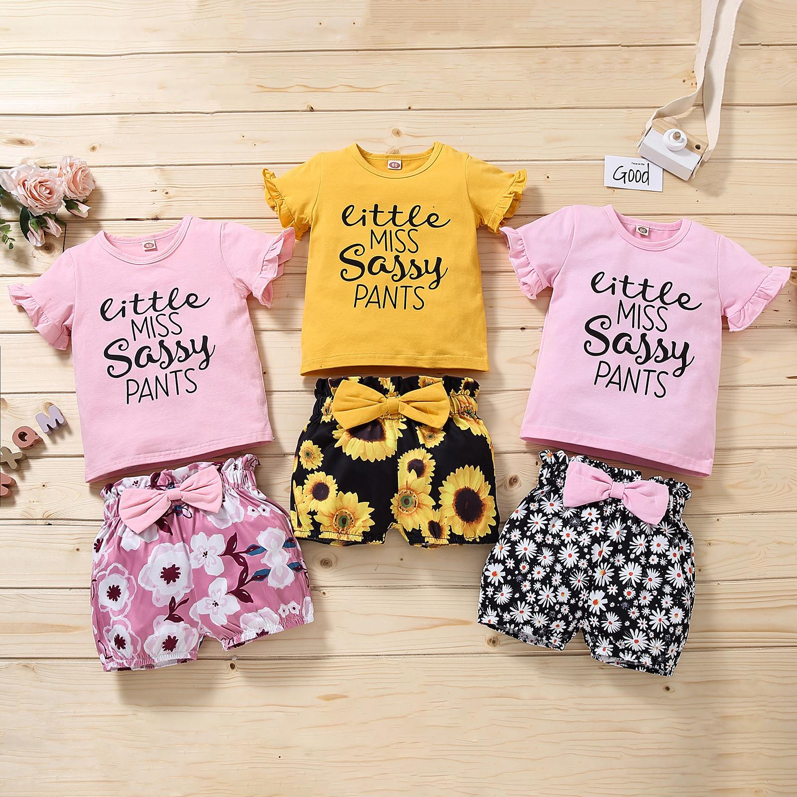 Футболка с рюшами для новорожденных девочек, топы + шорты с цветочным принтом, комплект одежды