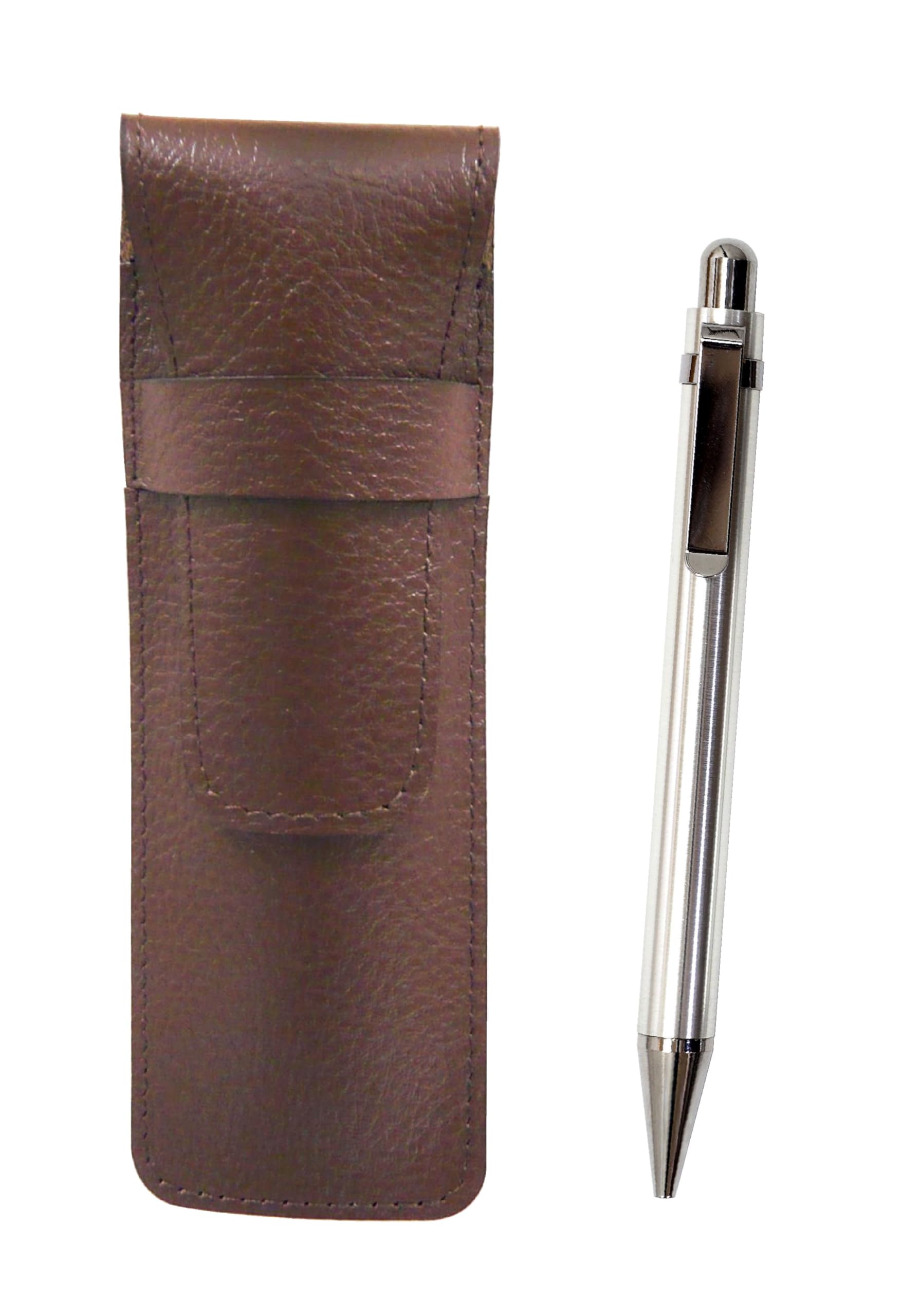 Футляр для карандашей из зернистой коровьей кожи шоколадного цвета. Цельнометаллический прочный набор шариковых ручек с прямым стержнем SASTYO-M11B