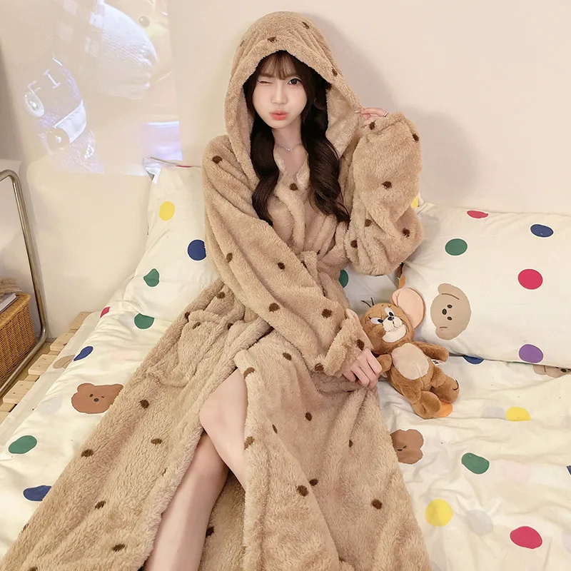 Халат с капюшоном, зимняя новая милая фланелевая пижама для девочек, сохраняющая тепло, ночная рубашка, утепленная женская домашняя одежда из кораллового флиса, халат
