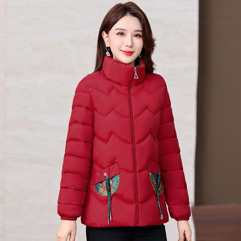 Хлопковая куртка для женщин среднего и пожилого возраста, молодая, тонкая, короткая, для мамы, осенне-зимняя, новая, вышитая, с воротником-стойкой, простроченная хлопковая куртка XL красный