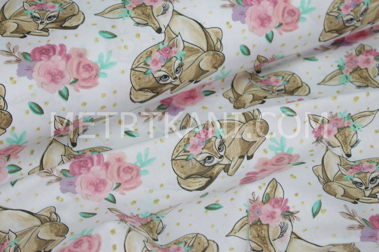 Хлопковая ткань "Косули с цветами " на белом фоне №1491