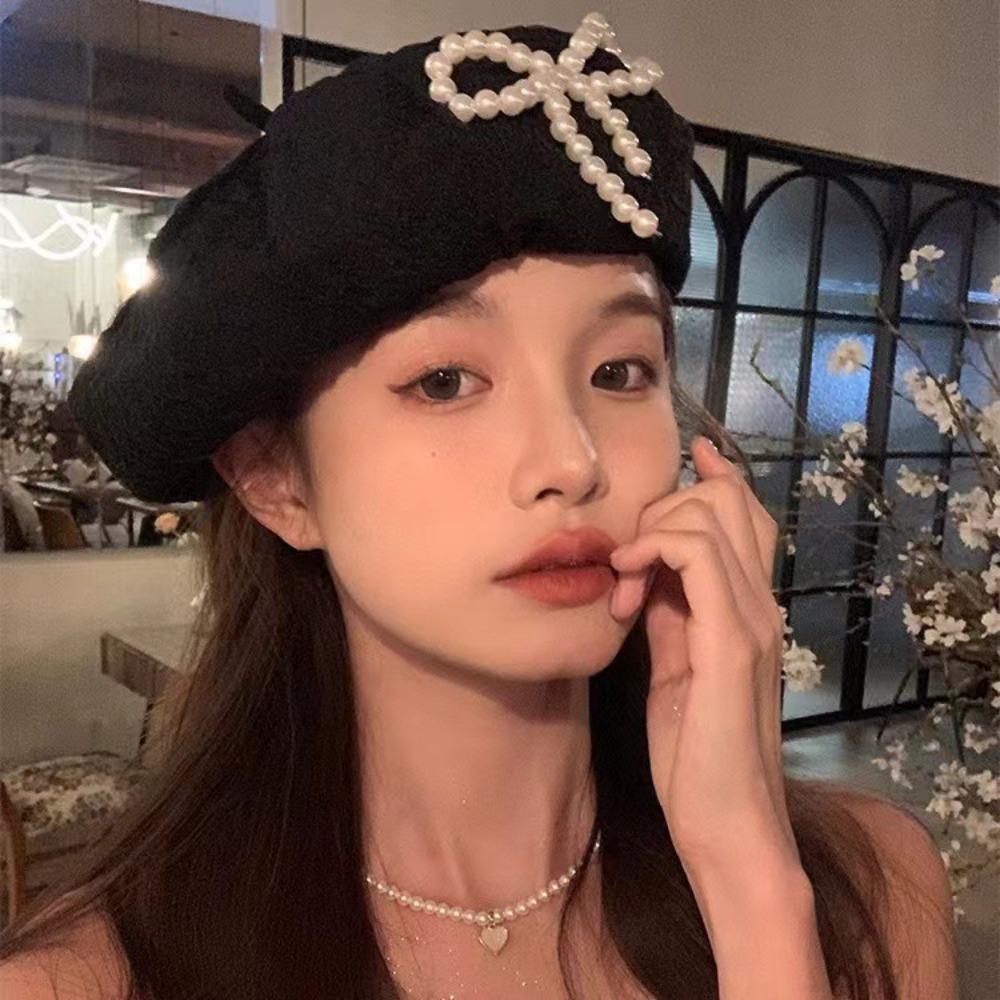 Хлопковые кружевные береты, кепка Y2K, восьмиугольная шляпа без полей, винтажная жемчужная бантовая мягкая шляпа для девочек чёрный