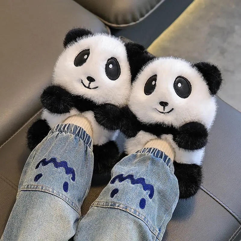 Хлопковые тапочки с милой мультяшной пандой, детская домашняя обувь для девочек с нескользящей полной оберткой для домашнего использования, детские плюшевые шлепанцы из меха животных