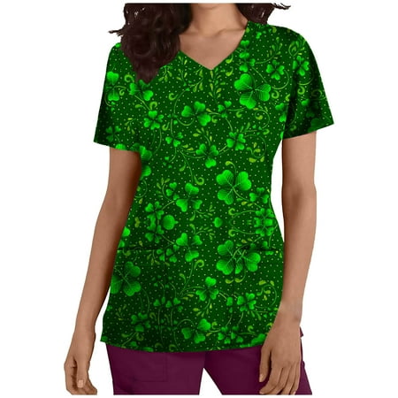 MELDVDIB Womens St Patricks Day Nursing Scrub Tops Working Uniform Short Sleeve V Neck Workwear Casual Summer Blouse T Shirts with Pockets Gift on Clearance