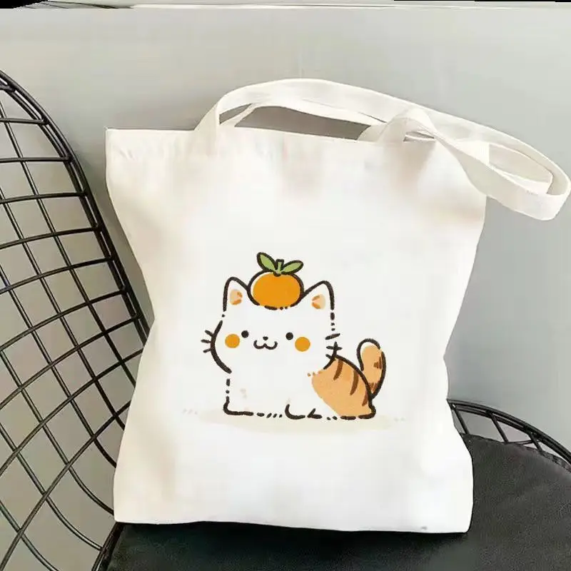 Холщовая сумка с мультяшным котом, простая большая вместительная милая студенческая сумка на одно плечо с принтом, большая вместительная дорожная сумка для покупок