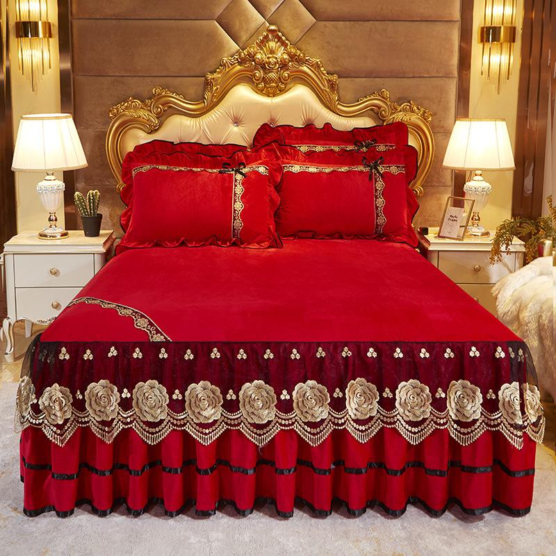 Хрустальный бархат, кружевная юбка-кровать, цельный термофланелевой наматрасник, фланелевое коралловое бархатное покрывало, комплект постельного белья из трех предметов 150*200cm 3pcs