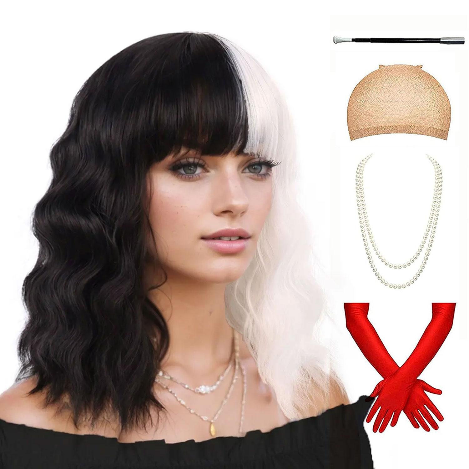 Хэллоуин Косплей Синтетический парик Круэлла Де Виль Куила Половина Черный Половина Сотня Маленьких Короткий Вьющийся Косплей Парик для Изготовления Париков as the picture-